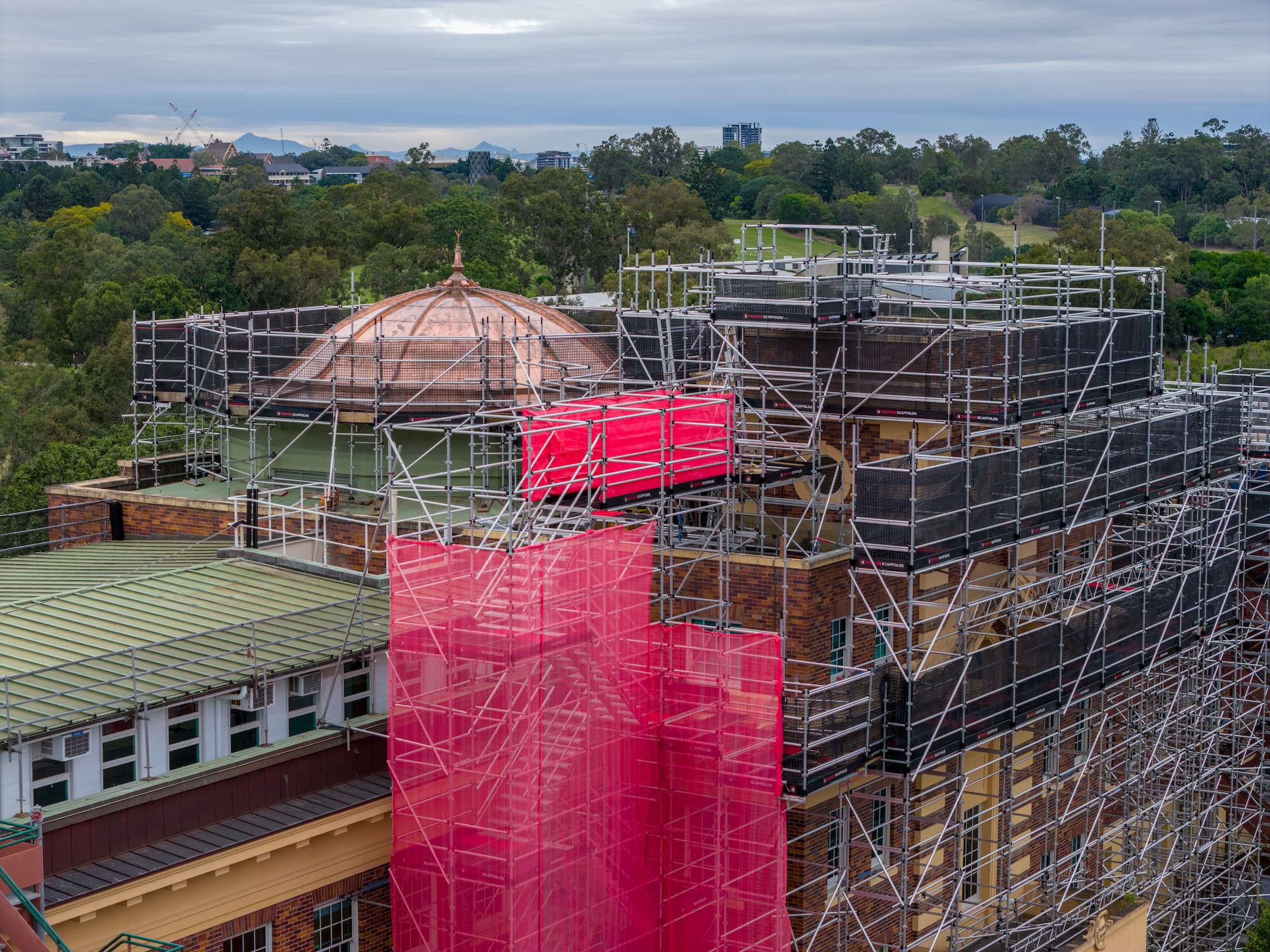 Cantilevered and drop scaffolds are ideal for a range of construction works, particularly in urban environments where construction sites are often surrounded by obstacles such as pedestrian pathways, landscaping, car parking, busy roads, or other buildings.